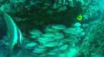 Einige Zeit lang kämpft der Steuermann mit maximaler Power des 200 PS Motors gegen exakt auf die Nase kommenden Wind und Welle. Wir versuchen uns krampfhaft an dem glitschigen, steil in die Luft ragenden Schlauchboot festzuhalten, die überkommende Gischt schlägt bei jeder Welle ins Gesicht. Schnell wird es klar, dass wir so das vereinbarte Ziel, den Leuchtturm von Amedee, nicht erreichen können. Wir fallen ab und fahren statt dessen zu Ila Metre. Wir sind so froh angekommen zu sein, dass wir nicht besonders darauf eingehen, dass unser Boot bei 20 Knoten Wind im Luv der Insel an eine Mooring gebunden wird und im ankommenden Schwell deutlich auf und ab hüpft. BCD an, Masken auf, schnell ins Wasser.